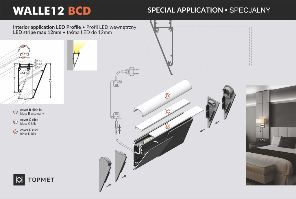 - Kompatibilitás: Maximum 12 mm széles LED szalagok beépítésére alkalmas.